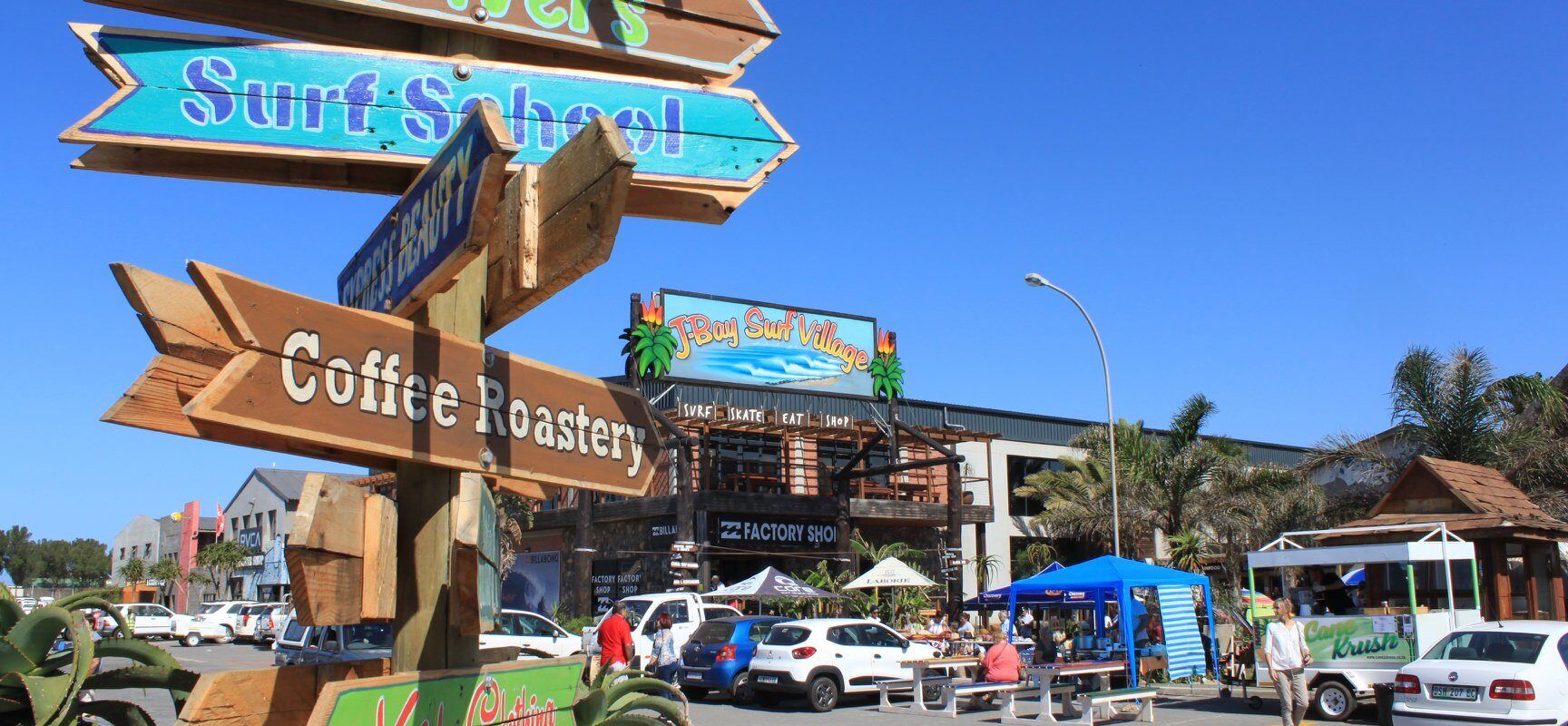 Surf Village à Jeffreys Bar est un centre commercial décontracté en plein air, avec plein de magasins de surf, de magasins d’usine, d’articles pour la maison, de délicieux restaurants et une touche de détente. C’est lieu incontournable depuis les années 80, célébrant la culture emblématique du surf et du skate de J-Bay. À quelques pas de Dolphin Beach, c’est l’endroit idéal pour dénicher des bonnes affaires Billabong, déguster une bière artisanale fraîche ou profiter d’un déjeuner en famille sous le soleil. Un passage obligé pour quiconque souhaite ressentir cette ambiance de shopping décontractée au goût d’air salin !
