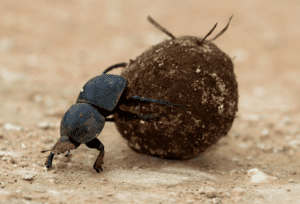 Voici le plus petit (et le plus dévoué) éco-guerrier du parc : le bousier volant ! Ce petit as du recyclage passe ses journées à rouler des boules d’excréments presque plus grosses que lui. Un vrai défi, non ? Imaginez-vous pousser une boule de bowling géante en montée toute la journée… Voilà, c’est ça, la vie du bousier. Mais ce n’est pas juste pour s’occuper : en plus de garder le parc bien propre, il enrichit les sols. Alors, si vous croisez l’un de ces as de la propreté, un petit applaudissement s’impose. Ils le méritent !