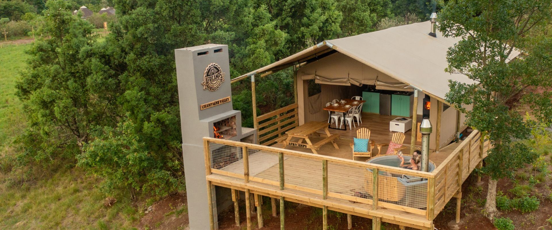 Situé au cœur de la vallée de Champagne, dans le centre des Drakensberg, AfriCamps Champagne Valley offre une vue spectaculaire sur les montagnes, un air vivifiant et un séjour sous tente qui ne se limite pas à l’essentiel. Le camp glamping (camping glamour) dispose de plusieurs tentes pouvant accueillir jusqu’à cinq personnes avec deux chambres, une cheminée intérieure, une cuisine entièrement équipée et une salle de bains privative avec une grande douche. La terrasse extérieure de 30 mètres carrés est équipée d’une table de pique-nique, de chaises longues, d’un espace barbecue. Il y a même un bain à remous chauffé au bois où vous pourrez prendre de belles photos souvenirs de votre apéritif, puis les partager grâce au Wi-Fi gratuit dans votre tente. De plus, avec une plaque de cuisson à quatre feux, un four à micro-ondes et un réfrigérateur, il est facile de cuisiner soi-même !