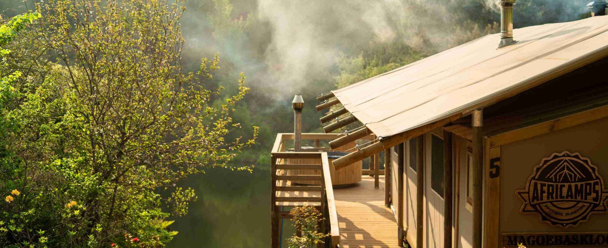 AfriCamps Magoebaskloof est situé à seulement 7 kilomètres du pittoresque village de Haenertsburg, où des prairies vallonnées, des fleurs de couleurs vives et une architecture de style alpin suisse vous font presque oublier que vous êtes au Limpopo. 10 tentes de glamping (camping glamour) entièrement équipées surplombent le fascinant Magoebaskloof et sont entourées de jardins luxuriants, de ruisseaux et de bassins agricoles (régulièrement visités par des espèces d’oiseaux exquises !). Elles comprennent toutes 2 chambres (chacune avec un lit queen size et un lit superposé supplémentaire), un salon, une salle à manger, une salle de bain avec douche, une kitchenette, une terrasse en bois privée et votre propre bain à remous alimenté au bois. Il y a même le Wi-Fi et la climatisation, que demander de plus pour un séjour en glamping ?