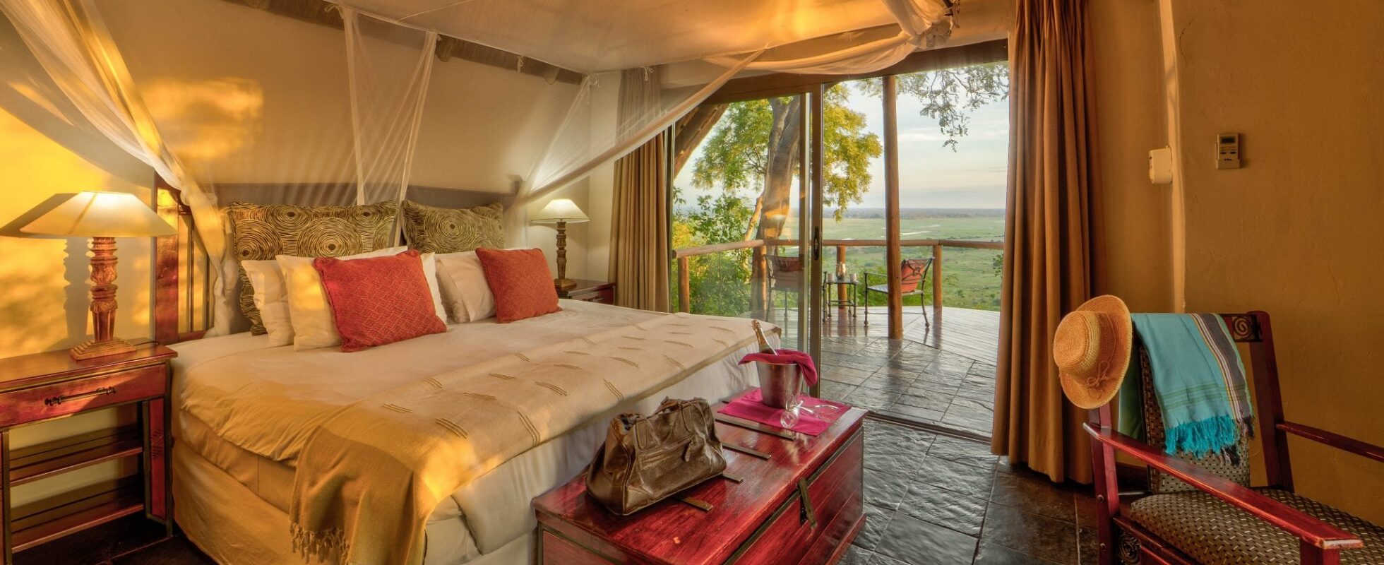Situé sur une falaise, dans la partie ouest plus calme du parc national de Chobe, le Muchenje Safari Lodge se trouve dans la réserve forestière de Chobe, sans clôture entre le lodge et la limite du parc, ce qui permet aux animaux de circuler librement ! Les 10 cottages privés au toit de chaume et le cottage familial disposent chacun d’une terrasse privée, d’une salle de bains privative, de la climatisation, d’un ventilateur de plafond et d’une vue sur la plaine inondable saisonnière. Le cottage familial dispose en plus d’une mezzanine pouvant accueillir deux enfants et de deux salles de bains. Vous prendrez vos repas en commun dans la salle à manger du lodge principal, qui surplombe la rivière et un point d’eau, mais vous pourrez également opter pour un dîner privé, un lapa au bord de la piscine ou un braai dans la brousse dans un boma voisin (les chefs proposent également des menus végétariens, végétaliens et sans gluten !).