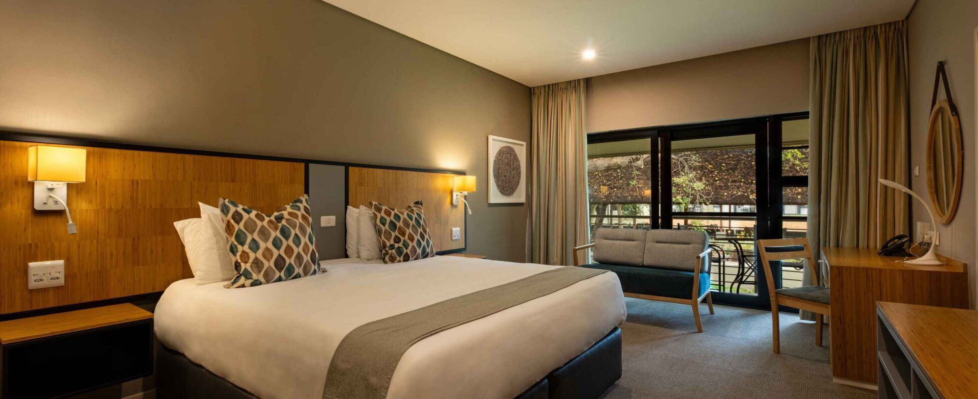 Situé au sein du fameux Skukuza Rest Camp dans le parc national de Kruger, Skukuza Safari Lodge offre une superbe expérience de brousse avec 128 chambres, dont des chambres familiales, où vous pouvez vous immerger dans la beauté immaculée de la vie sauvage africaine tout en appréciant des conforts luxueux. Les chambres sont dotées de salles de bain avec des douches à l’italienne et de lits king-size ou jumeaux, de la climatisation, d’un bureau, d’un minibar, d’un coffre-fort, de la télévision par satellite, du Wi-Fi et d’une terrasse privée. Après vos aventures en safari, détendez-vous au bar, partagez vos histoires avec d’autres voyageurs, et ravissez vos papilles dans l’excellent restaurant. Et si vous ressentez le besoin de vous rafraîchir et vous reposer, faites un plongeon dans la piscine ou profitez d’un massage relaxant au spa. Et pourquoi ne pas tenter un tour sur le green au Skukuza Golf Club, le plus grand club de golf du monde installé au milieu des hippopotames, impalas et phacochères ?