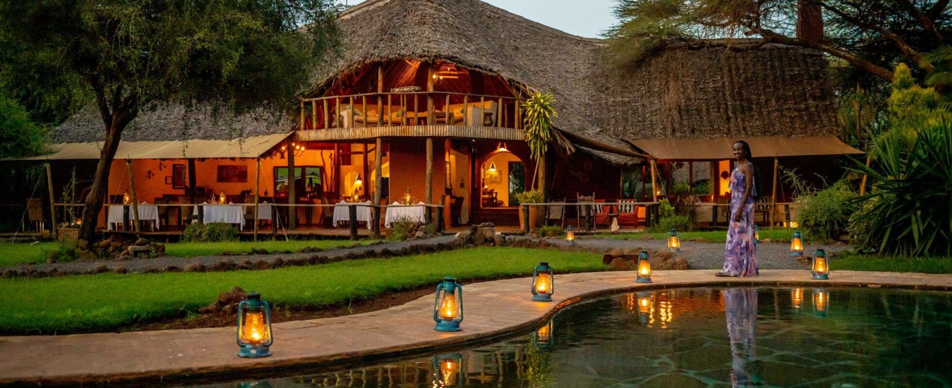 Le Tawi Lodge est situé sur un terrain privé, à cinq minutes de route de la porte est Kimana du parc national d’Amboseli. Il bénéficie d’une vue magnifique sur le mont Kilimandjaro qui se dessine au loin et sur un point d’eau situé à proximité. Ici, les éléphants, les zèbres, les impalas, les koudous, les gérénuks et bien d’autres encore viennent en masse s’abreuver chaque jour. Situé au milieu de la savane et des éléphants, ce lodge au style moderne et confortable est entouré de pelouses bien entretenues et d’un jardin luxuriant. Les chambres sont ornées de bois sombre, de murs blanchis à la chaux et d’un toit de chaume. Le mobilier est robuste et confortable et la vue depuis les terrasses des cottages est tout simplement incroyable. La partie principale du lodge est spacieuse, avec à l’intérieur un restaurant, un bar, un espace lounge et une cheminée, et à l’extérieur une piscine, une terrasse et un feu de camp. Les chefs cuisiniers adorent expérimenter de nouvelles recettes en utilisant exclusivement des ingrédients frais et élaborent des plats exquis, d’inspiration européenne et swahilie. Il s’agit d’un endroit charmant !